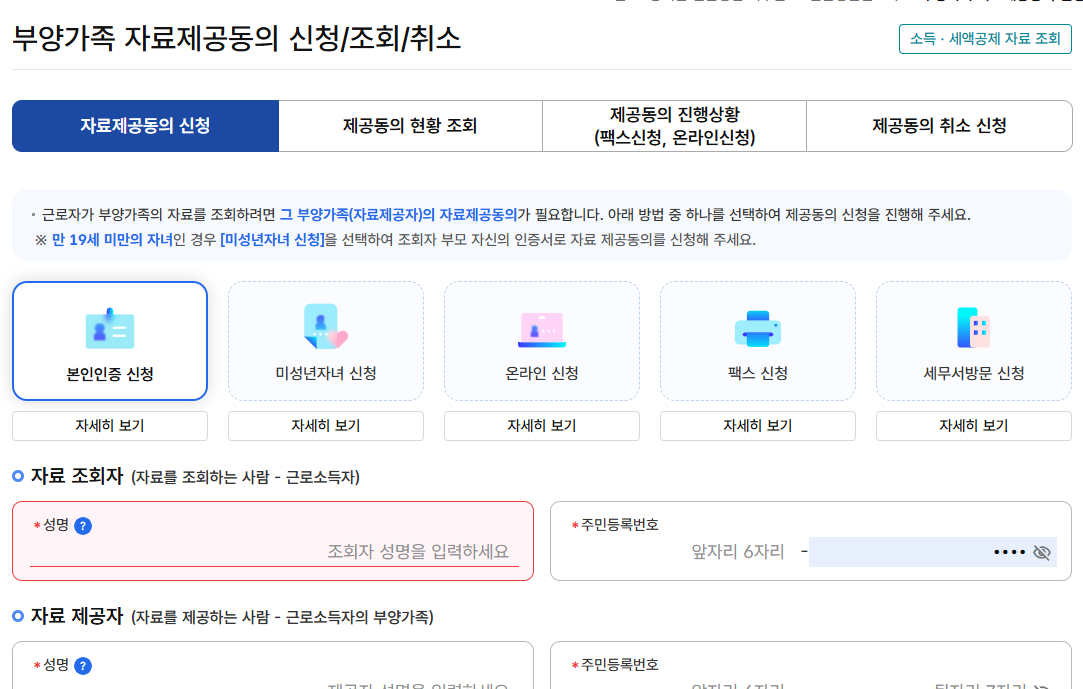 부양가족 본인 인증을 통해 자료제공동의를 신청할 수 있습니다.