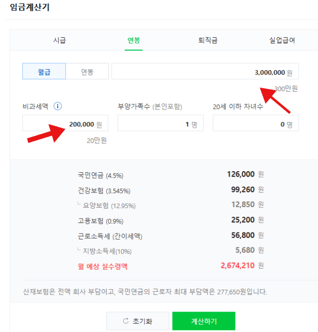 비과세수당을 잘 입력해야 급여가 일치하게 나와요. 처음 급여금액에는 기본급과 모든 수당의 총액을 입력해 주세요.
